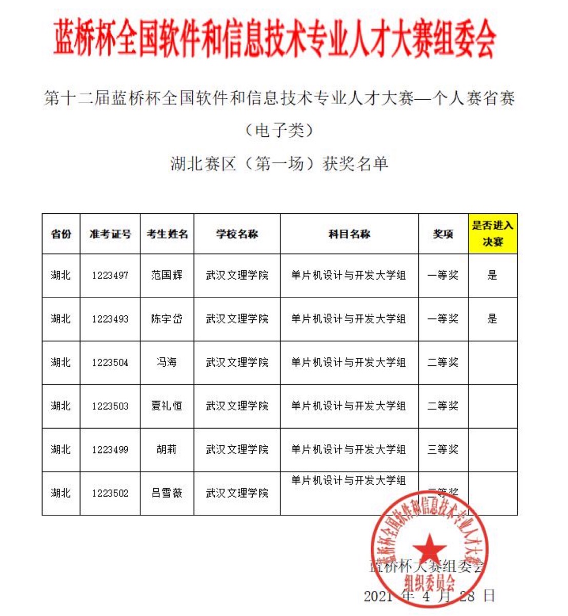 近日,从第十二届“蓝桥杯”全国软件和信息技术专业人才大赛组委会(省赛)传来喜讯。学子喜获湖北赛区一等奖3项、二等奖3项、三等奖2项。其中3人取得国赛参赛资格。
