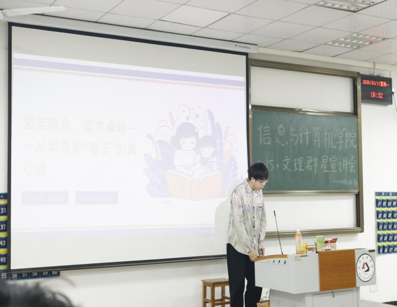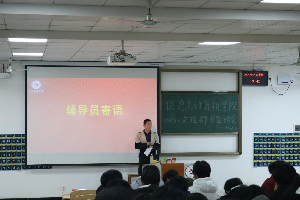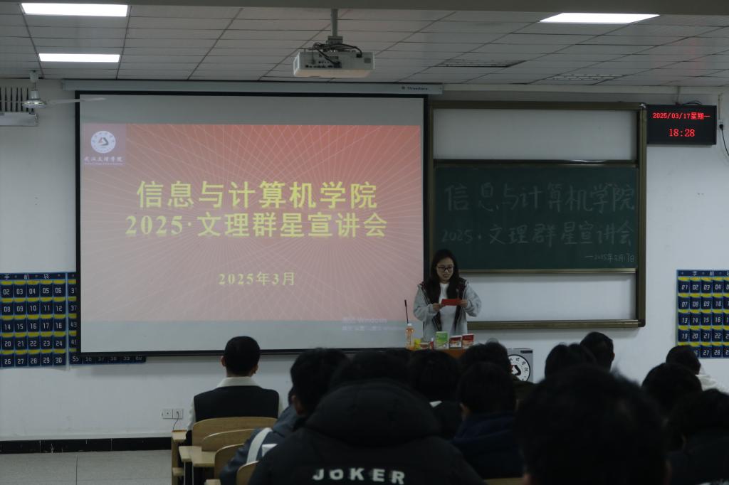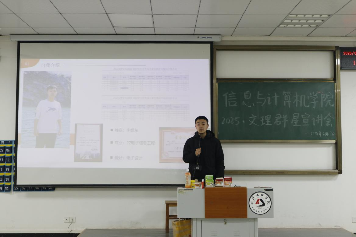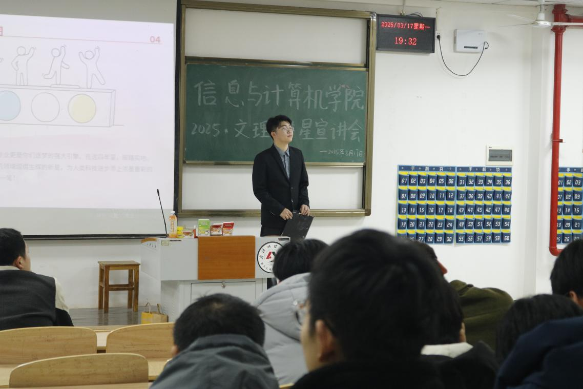 为展示优秀学长学姐的风采,引导同学们向优秀看齐,提升大家的学习热情,追求全面发展,304永利集团于2025年3月17日星期一18:30在4-121教室为2024级计算机科学与技术类专业员工成功举办了第一场文理群星宣讲会。