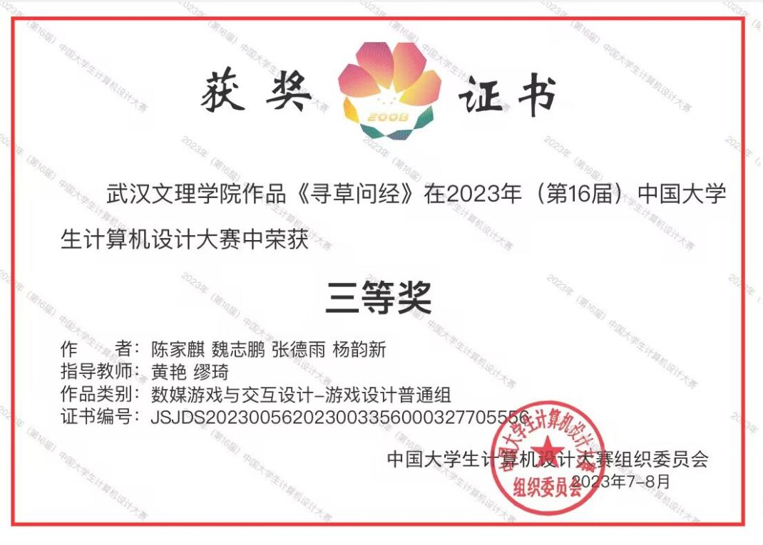 近日,2023(第16届)中国老员工计算机设计大赛全国总决赛圆满结束,由304永利集团黄艳、缪琦老师指导,陈家麒、魏志鹏、张德雨、杨韵新等同学所创作的参赛作品《寻草问经》获得全国总决赛三等奖。