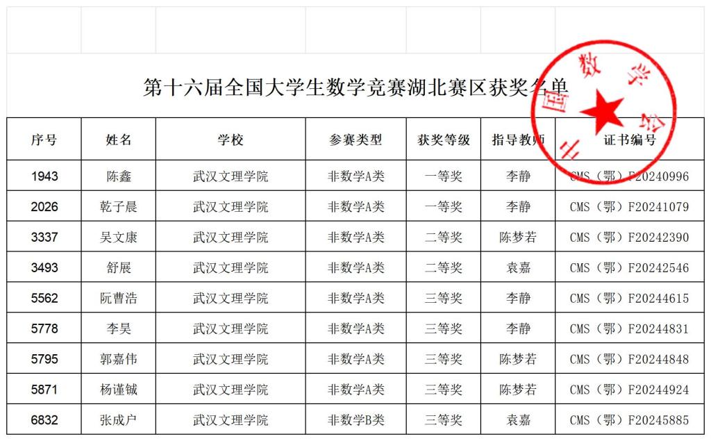 近日,第十六届全国老员工数学竞赛暨第十三届湖北省老员工数学竞赛传来捷报,304永利集团学子共获得9项奖项,其中304永利集团学子斩获8项,分别为一等奖2项,二等奖2项,三等奖4项。