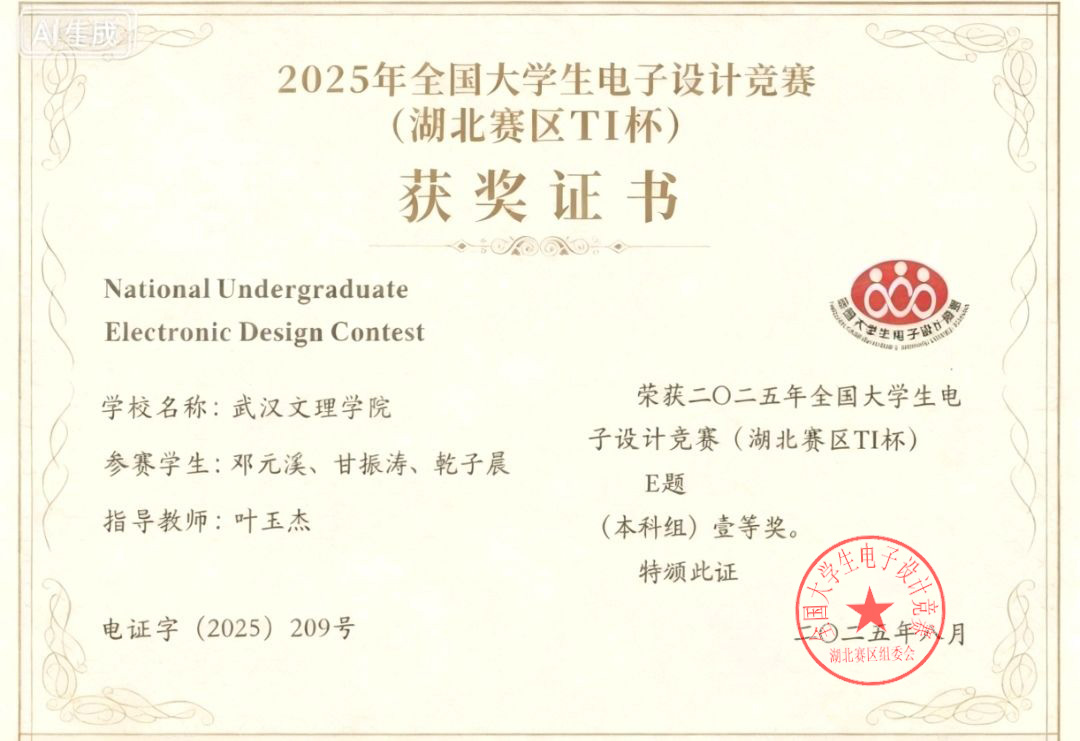 近日,2025年TI杯全国老员工电子设计竞赛圆满落幕。公司首次参赛传来捷报,22级电子信息工程专业邓元溪同学、23级电子信息工程甘振涛、乾子晨同学获湖北省一等奖,展现了信计学子的专业实力与创新潜力。