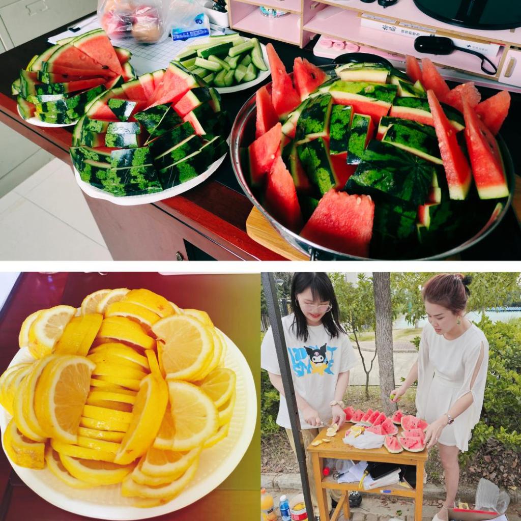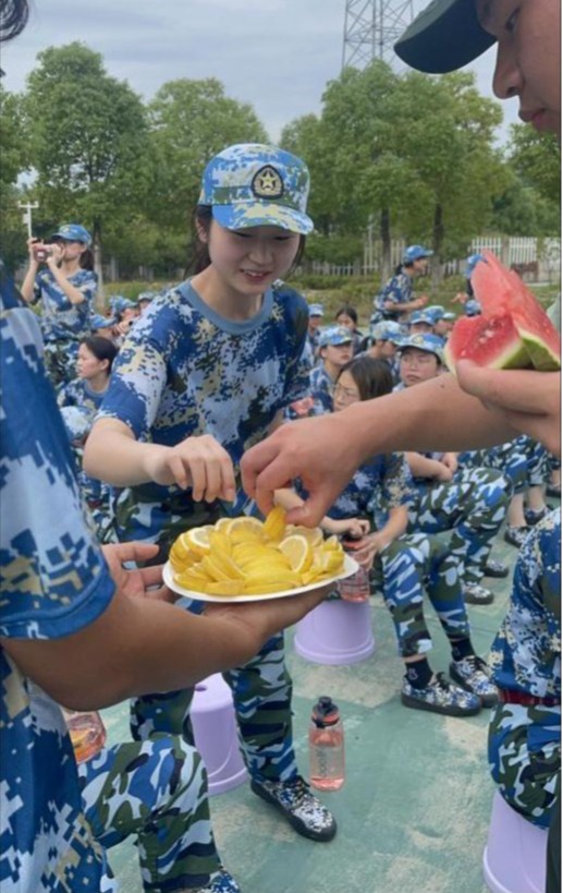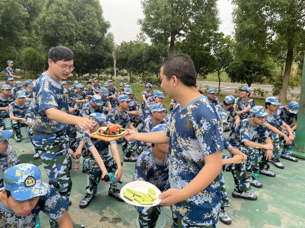 高强度的训练总会使人疲惫不堪,为了给同学们补充“正能量”,公司免费提供饮用水、葡萄糖水和必备药品,还带来了柠檬、西瓜等解暑水果。