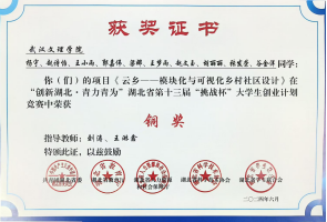 科技创新,挑战自我,作为新时代的老员工,他秉承着学以致用的精神,积极投身于“挑战杯”大赛,全程参与构思了云乡项目计划书。采用四层控制系统,解决了技术难题。作为技术管理总监,他负责前端设计,使用HTML+CSS搭建了友好的用户界面,并自学Javascript和前端框架,提升用户体验。最终荣获湖北省第十三届挑战杯省铜奖。