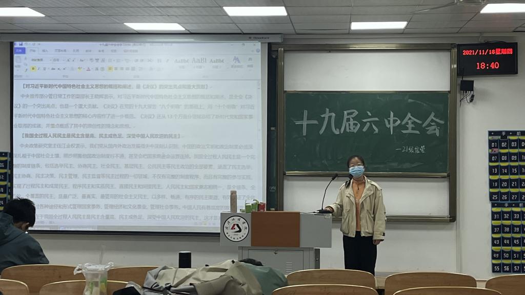 然后,我们进行了通过阅读十九届六中全会的学习材料的讨论,同学间相互交流自己的理想和想法。 大家一致认为,全会审议通过的《中共中央关于党的百年奋斗重大成就和历史经验的决议》,是一篇光辉的马克思主义纲领性文献,是新时代中国共产党人牢记初心使命、坚持和发展中国特色社会主义的政治宣言,是以史为鉴、开创未来、实现中华民族伟大复兴的行动指南。 并且通过这次学习,我们知道了《决议》的重要意义,我们还另外了解了《决议》的基本框架和主要内容。